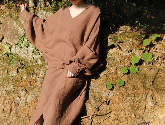 Brown Linen V-neck Blouse with Balloon Sleeves bl0087 26018