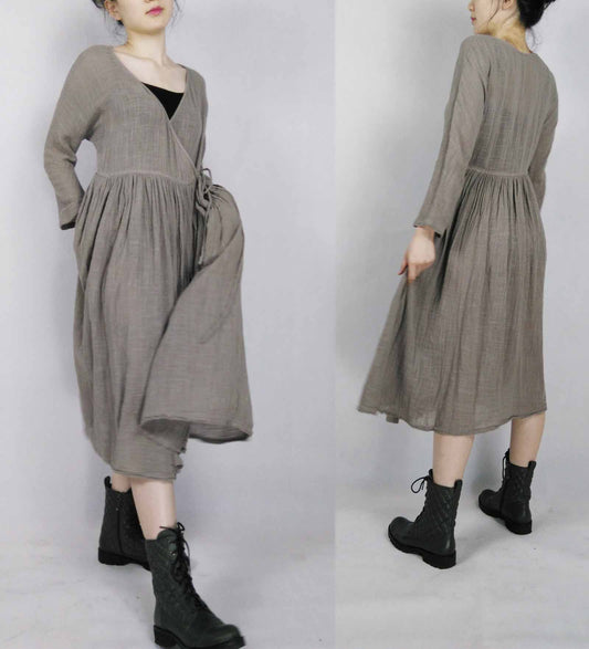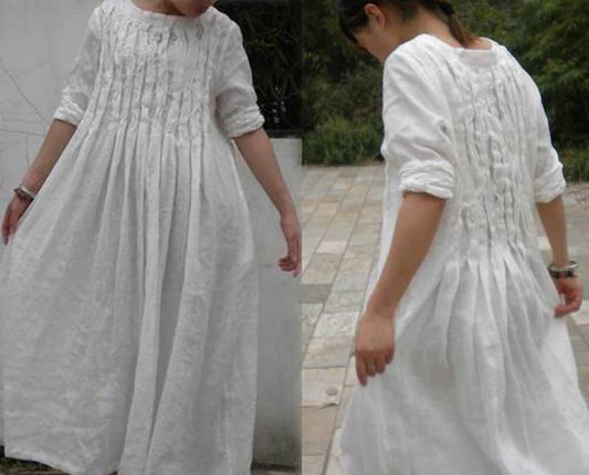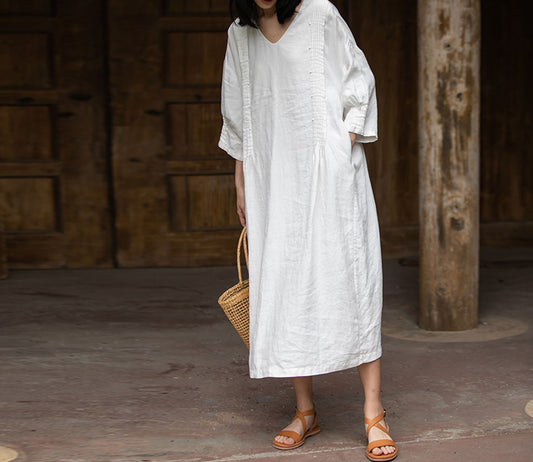 Pintucked V-neck Linen Dress dr0009 C028